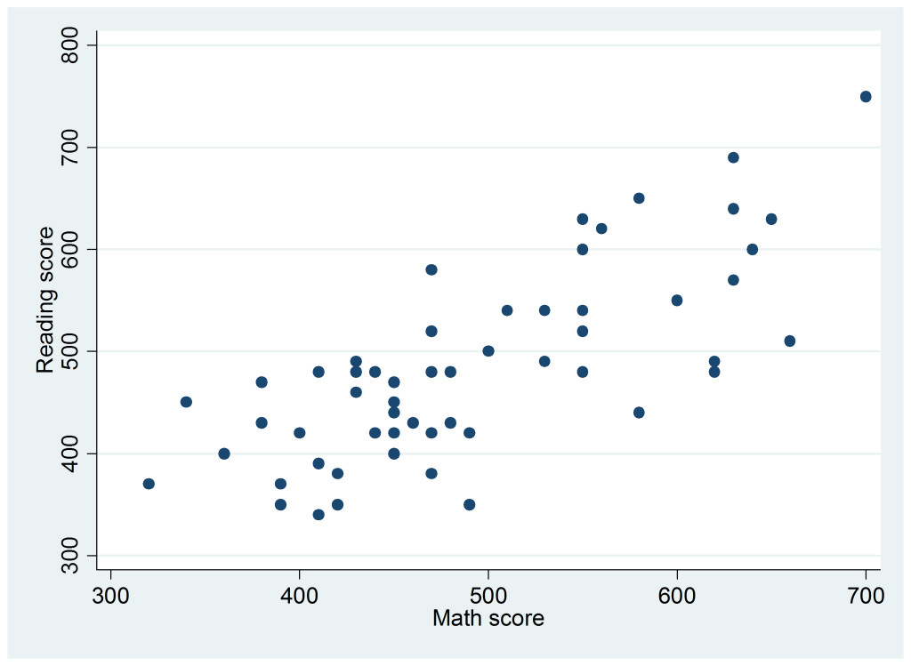 With this data we can test our null hypothesis (Ho) that the means of the reading and math scores are equal, i.e. that there is no significant difference between them. The alternate hypothesis (Ha) is that the average math score is significantly greater than the average reading score, at a 5% level of significance. Using a paired t test assumes that the means are dependent, since both scores are from the same student. A calculated t score of 0.957 results in a ρ value of 0.17, which exceeds the 0.05 level of significance for a one-tailed test. Therefore, we are unable to reject the null hypothesis. For comparison, we might assume that the means of reading and math score are independent of each other, since they are testing two (seemingly) separate skills. An unpaired t test results in a calculated t score of 0.477, for an even higher ρ value of 0.317. In either case, we fail to reject the null hypothesis and conclude there is no significant difference between a student’s math and reading score in general. In addition, the Pearson’s correlation coefficient between the students’ math and reading scores is a rather strong +0.752.